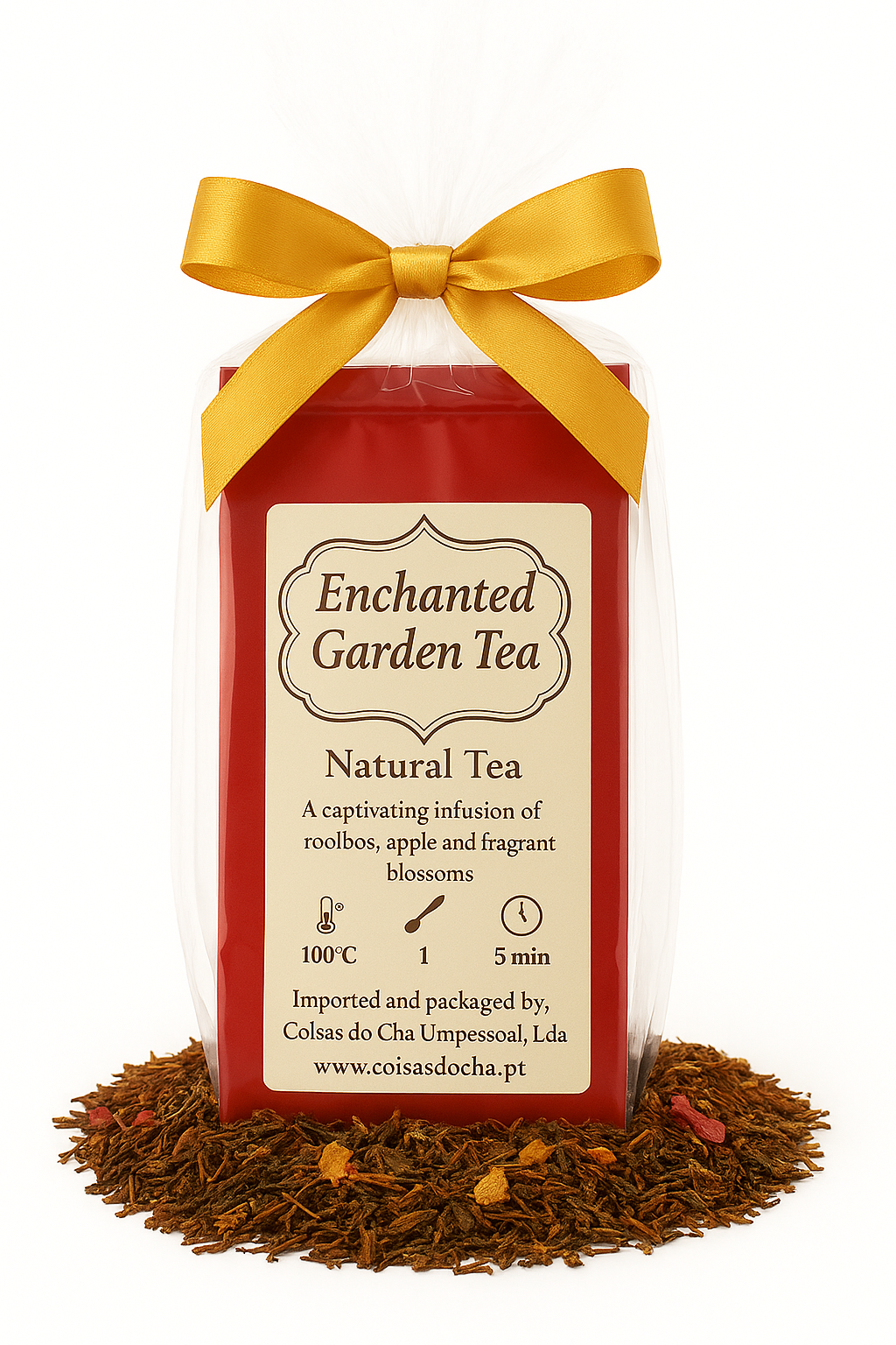 Entre num mundo fantástico de tranquilidade com o Chá Jardim Encantado , uma infusão cativante que combina o sabor suave e naturalmente doce do rooibos com a delicada essência da maçã e um bouquet de flores perfumadas . Cada gole é um abraço suave , evocando a serenidade de um jardim escondido em plena floração .